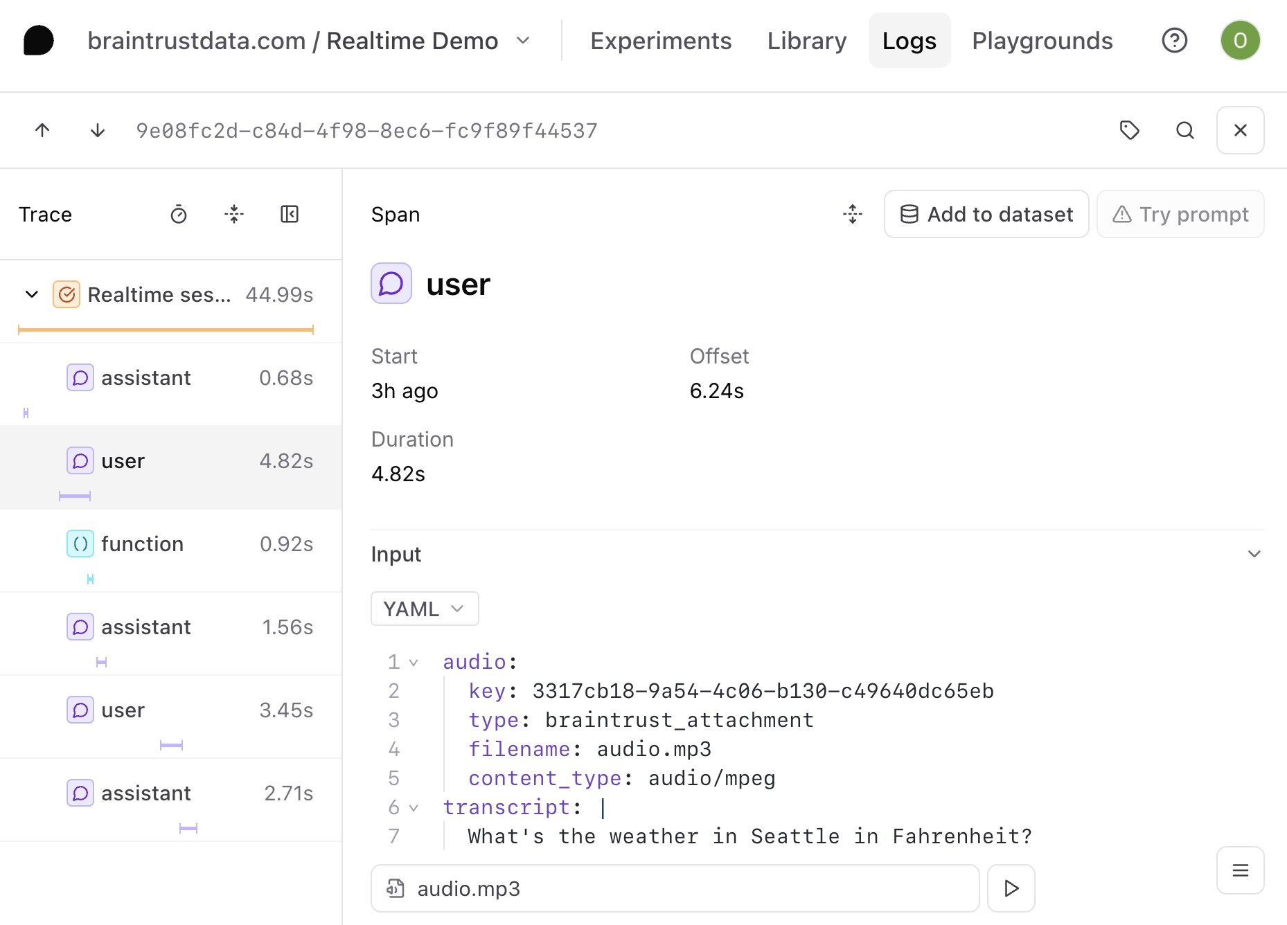 In addition to client-side authentication, you’ll also get the other benefits of building with Braintrust, like logging, built in. We support logging audio, as well as text, structured data, and images. When you connect to the Realtime API, a log will begin generating, and when your session is closed, the log will be ready to view. Each LLM and tool call will be contained in its own span inside of the trace. And most importantly, all multimodal content is now able to be uploaded and viewed as an attachment in your trace. This means that you won’t have to exit the UI to double-click on an LLM call and view the input and output, no matter what type of format its in.