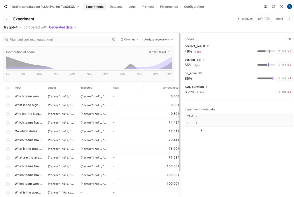 Braintrust makes it easy to filter down to the regressions, and view a side-by-side diff: