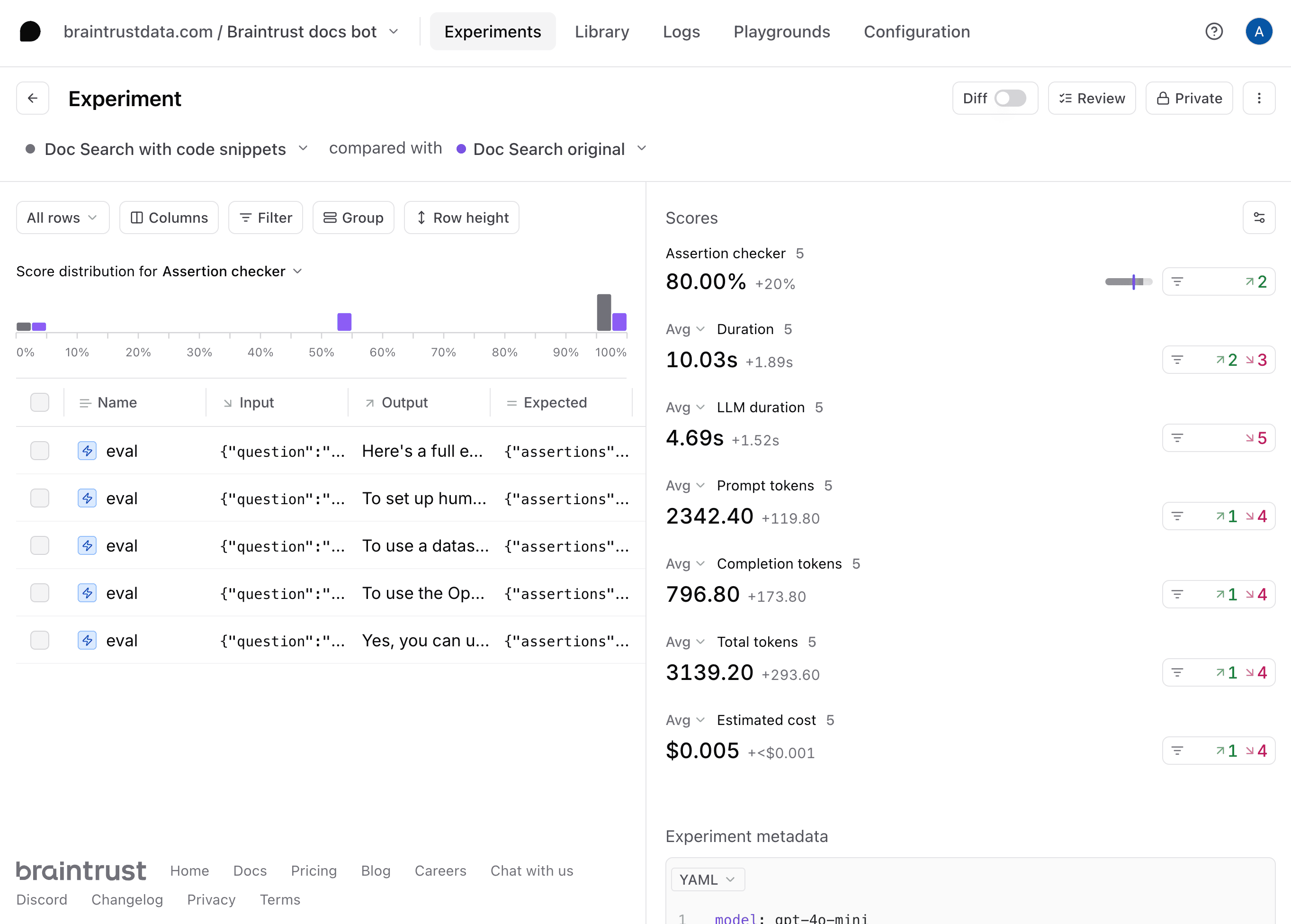 In this cookbook, we'll define an agent that answers questions about the Braintrust documentation, iterate on it in the Braintrust playground, and use scorer functions to evaluate the results.