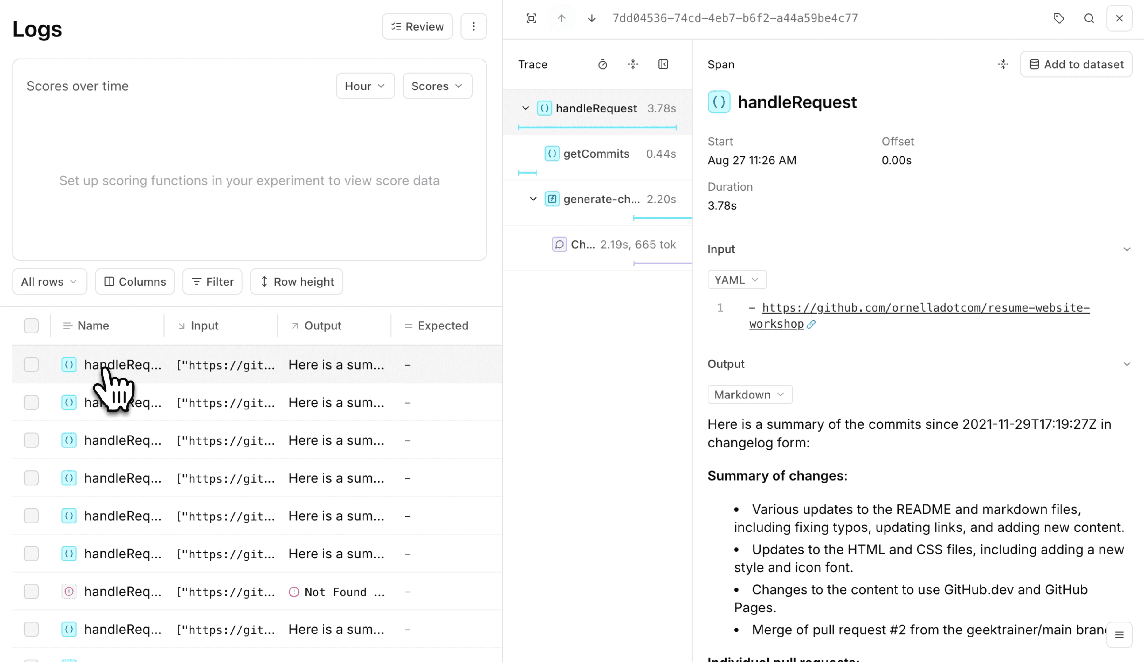 Traditional observability tools monitor performance and pipeline issues, but generative AI projects require deeper insights to ensure your application works as intended. As you continue using the application to generate changelogs for various GitHub repositories, you’ll notice every function call is logged, so you can examine the input and output of each call.